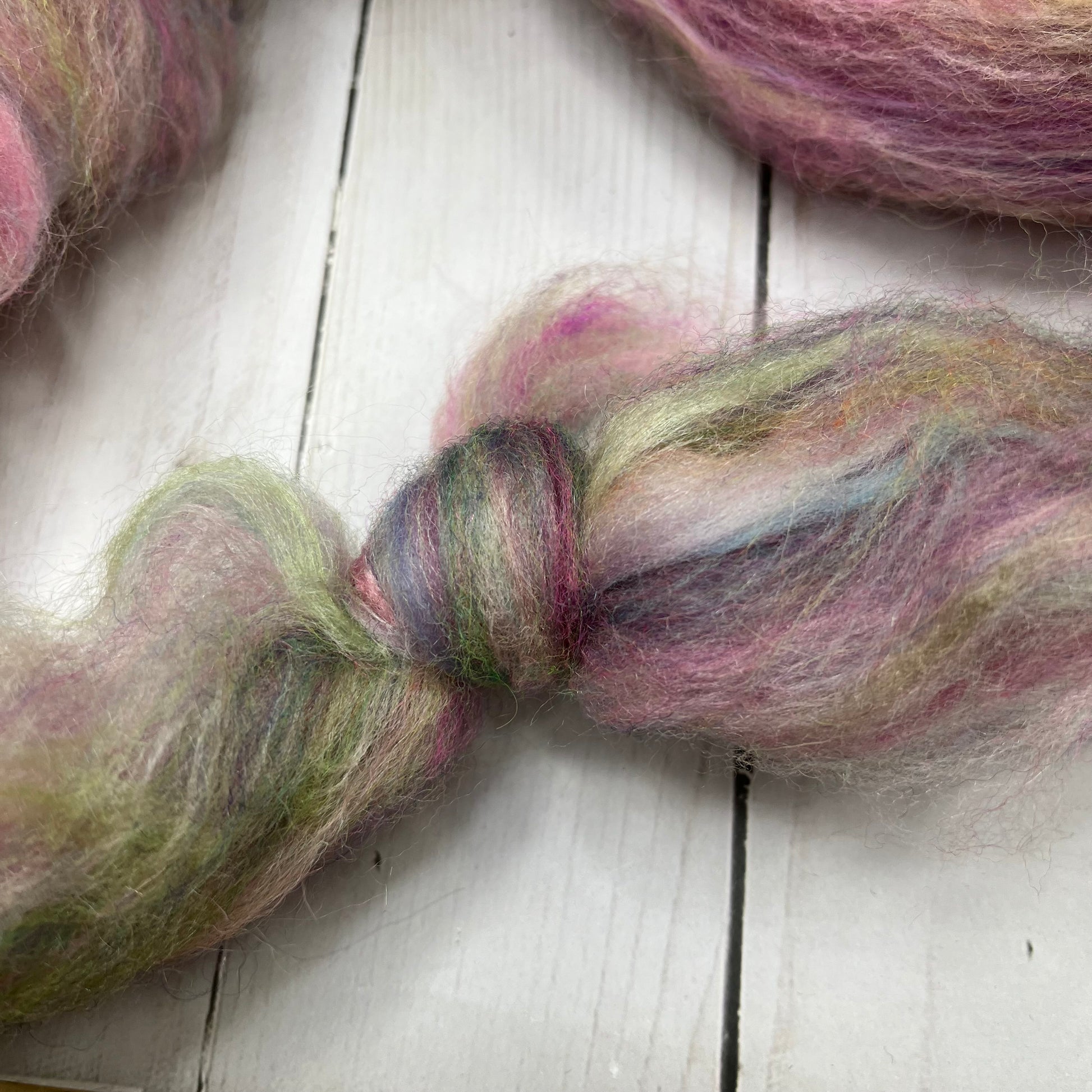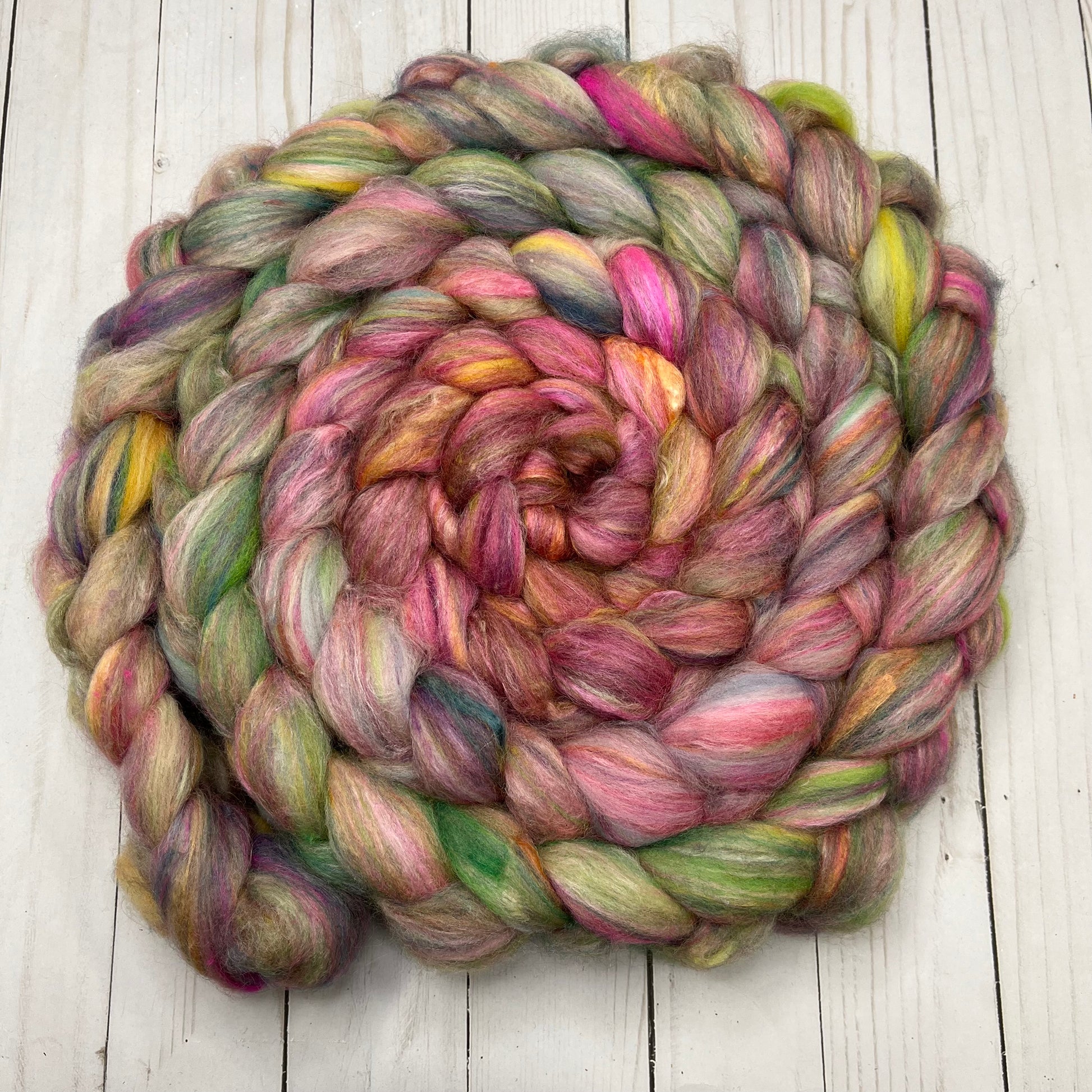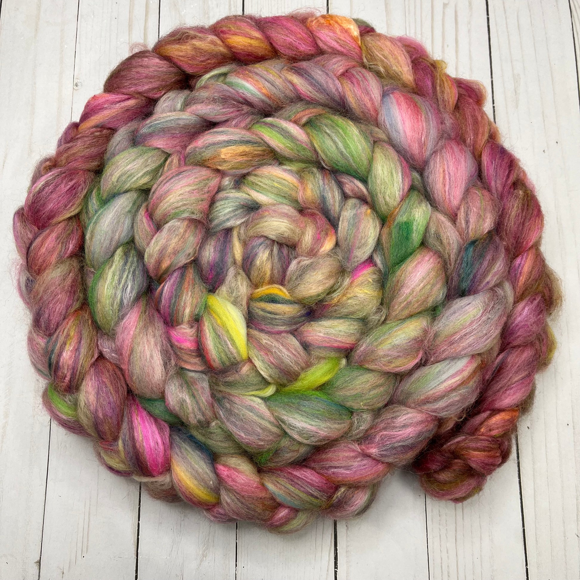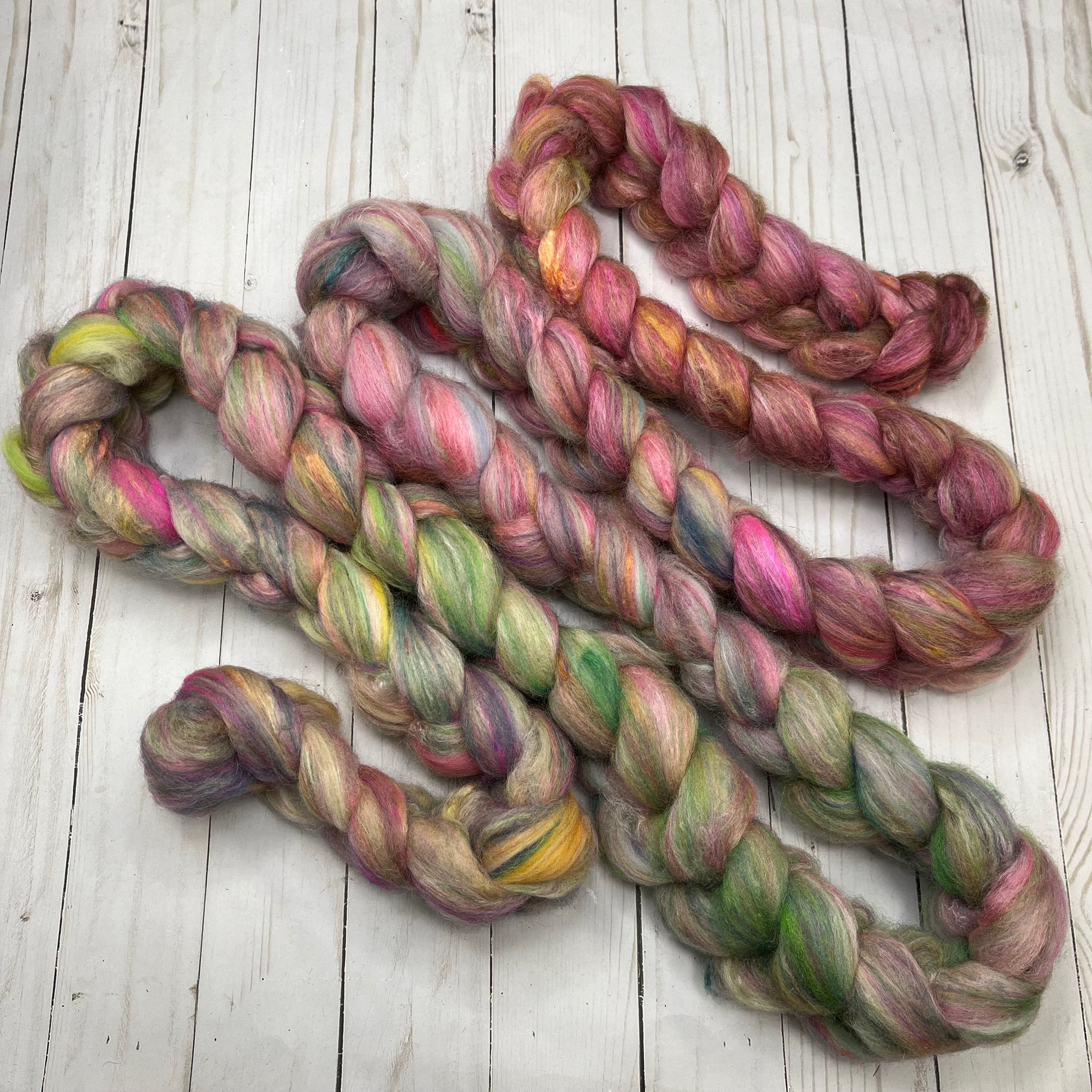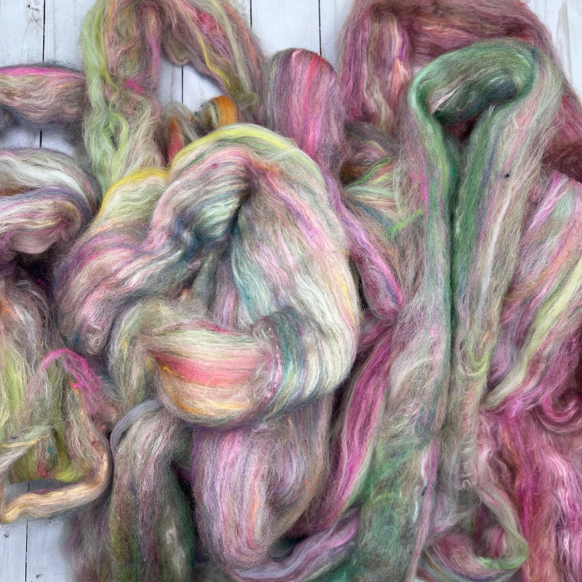 OOAK Blend of many many many ingredients, some dyed by me, some dyed by other artists, carded then pulled into this OOAK roving. 7.3oz/208g total. Ingredients include Merino-BFL-Rambouillet-Sari Silk-Mohair-Stellina-Tussah Silk-Bamboo. There are a couple spots that broke while pulling from the drum, so it is proportionally discounted!