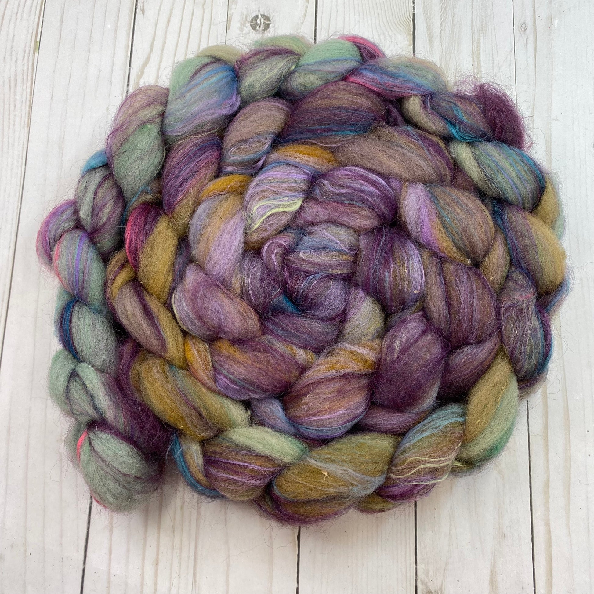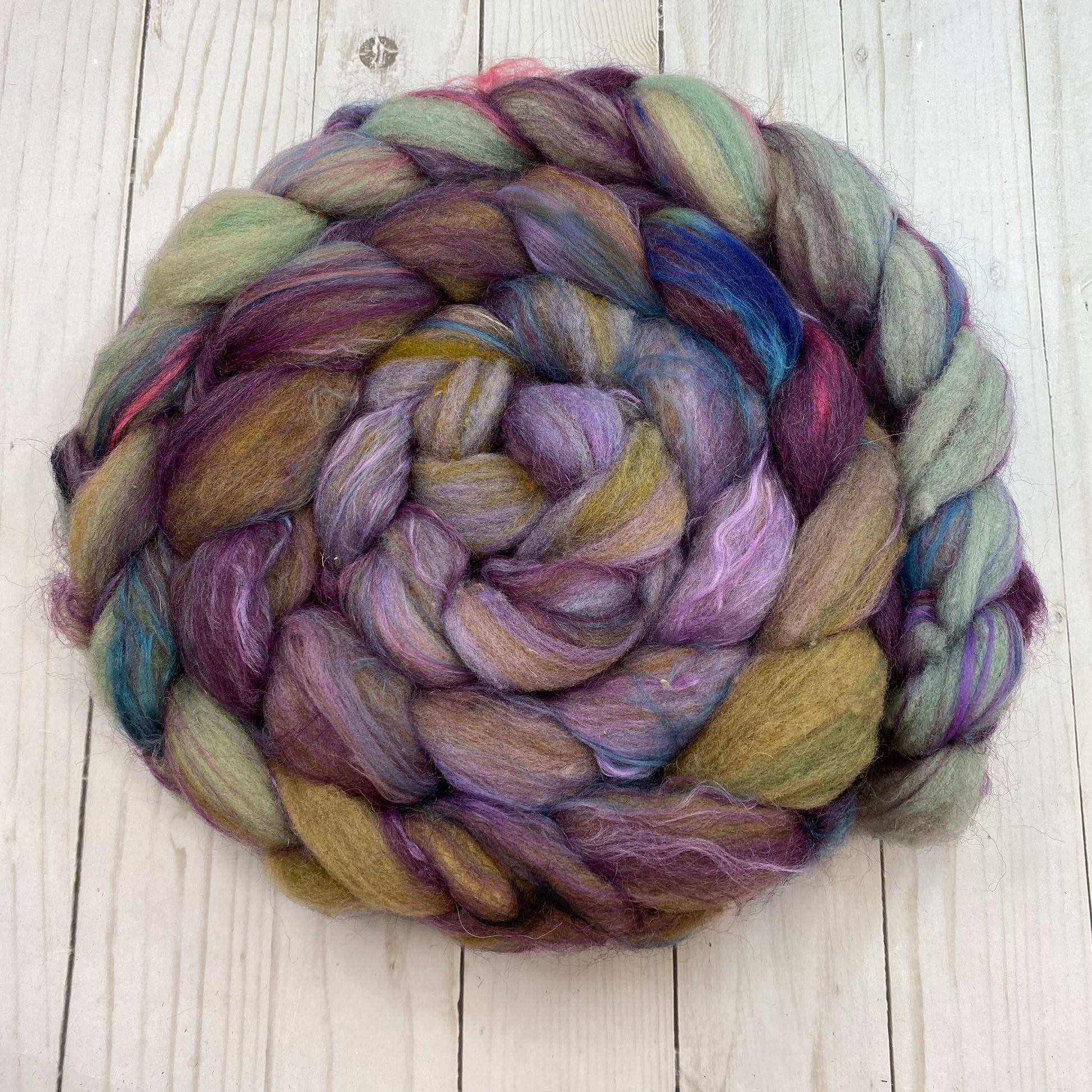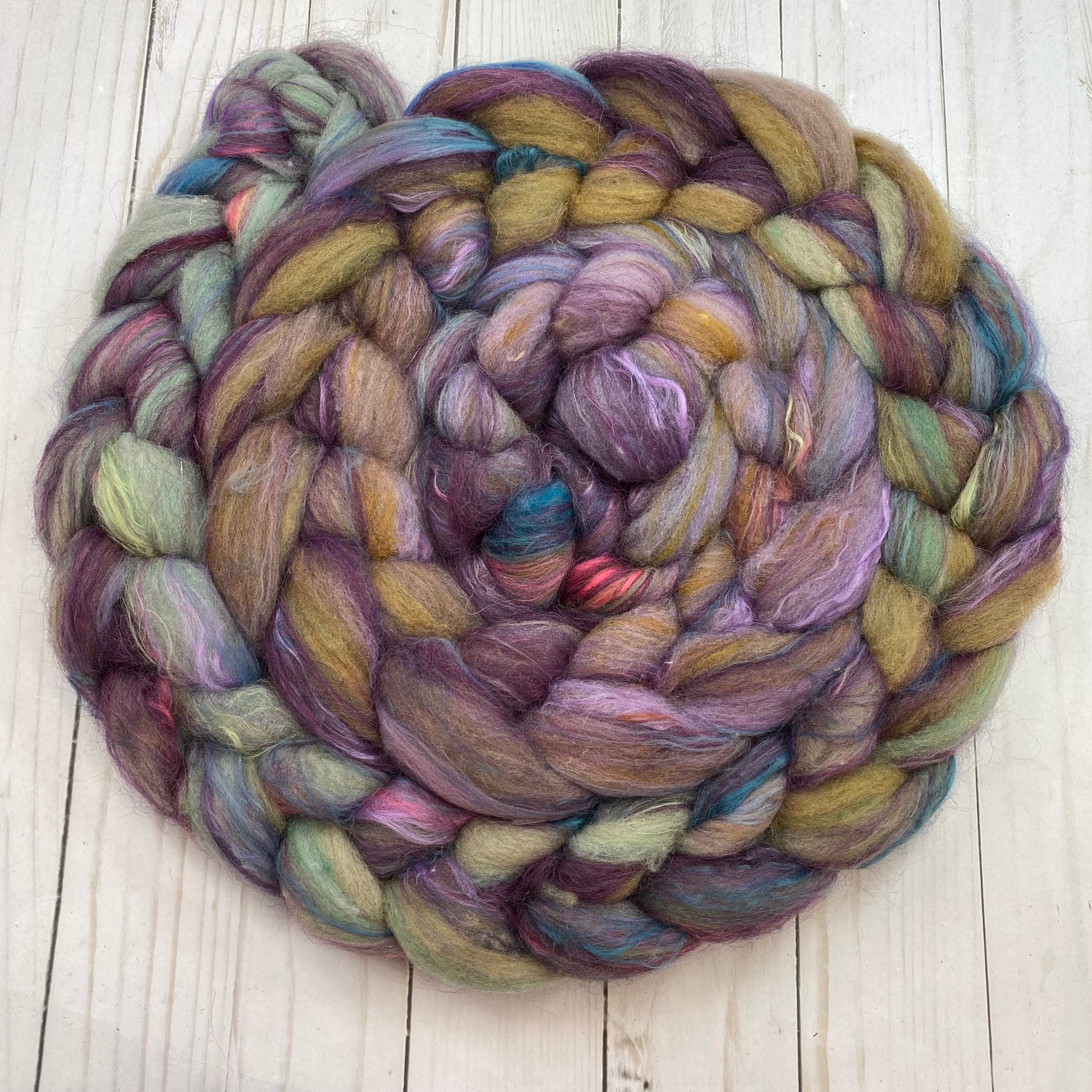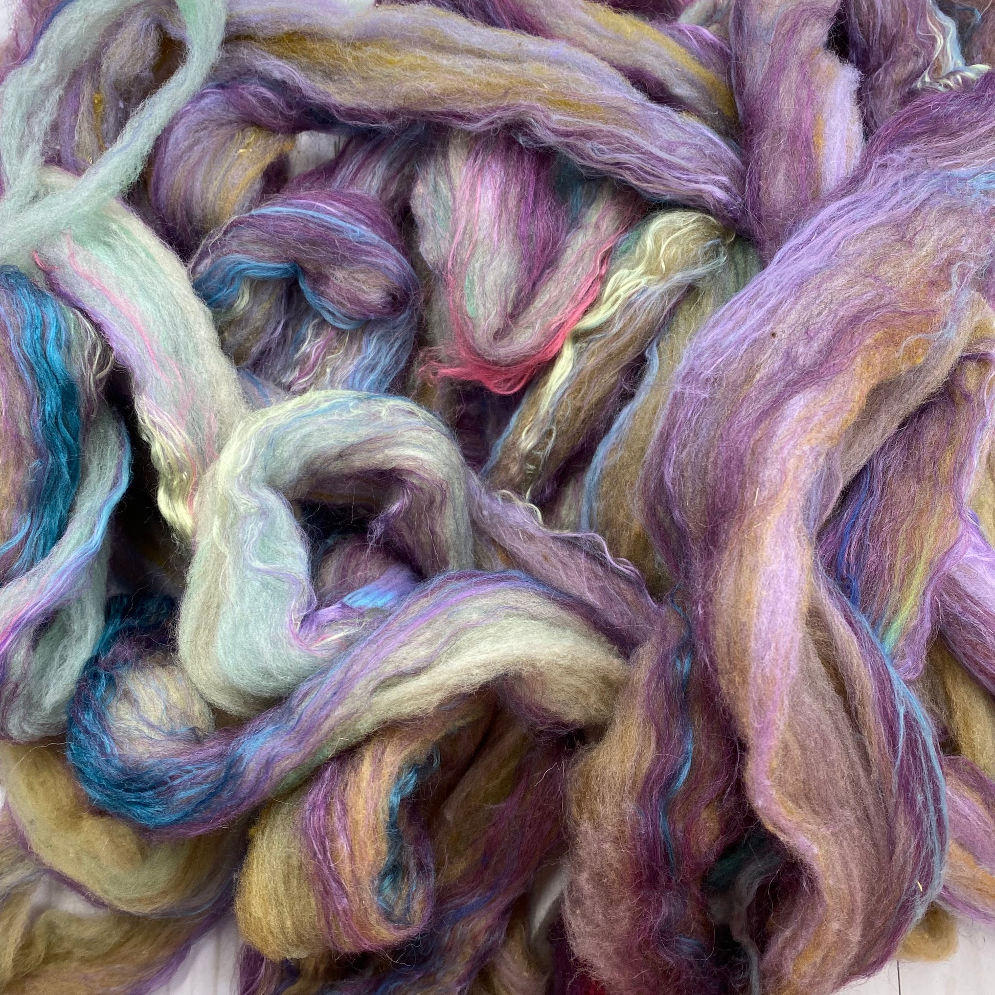 OOAK Blend of many many many ingredients, some dyed by me, some dyed by other artists, carded then pulled into this OOAK roving. 4.52oz/128g total. Ingredients include Merino, Targhee, Starbrite, Bamboo, Shetland, BFL, Nylon