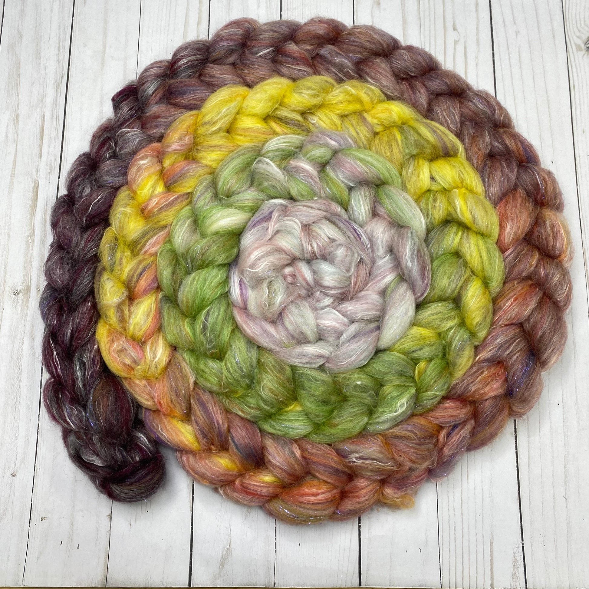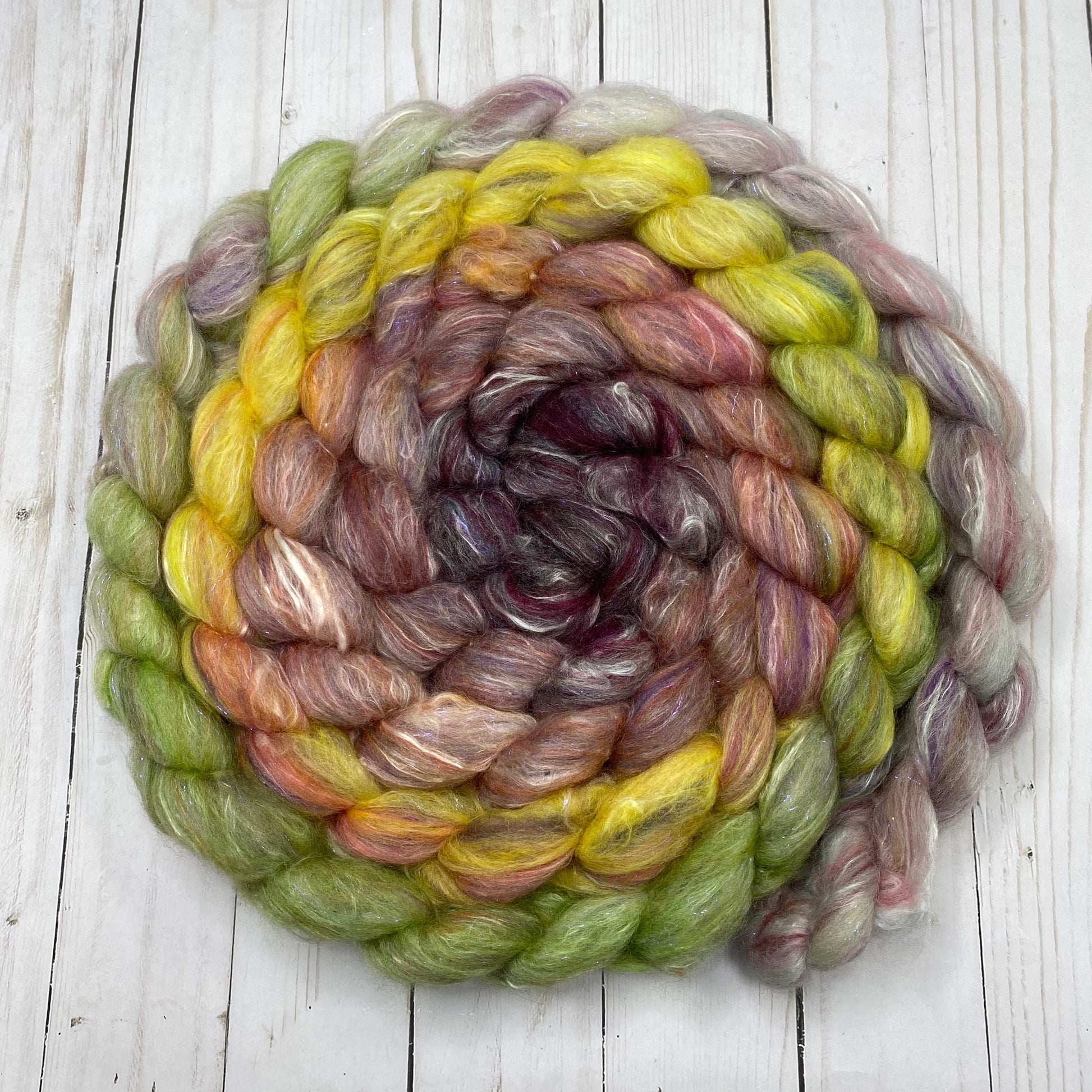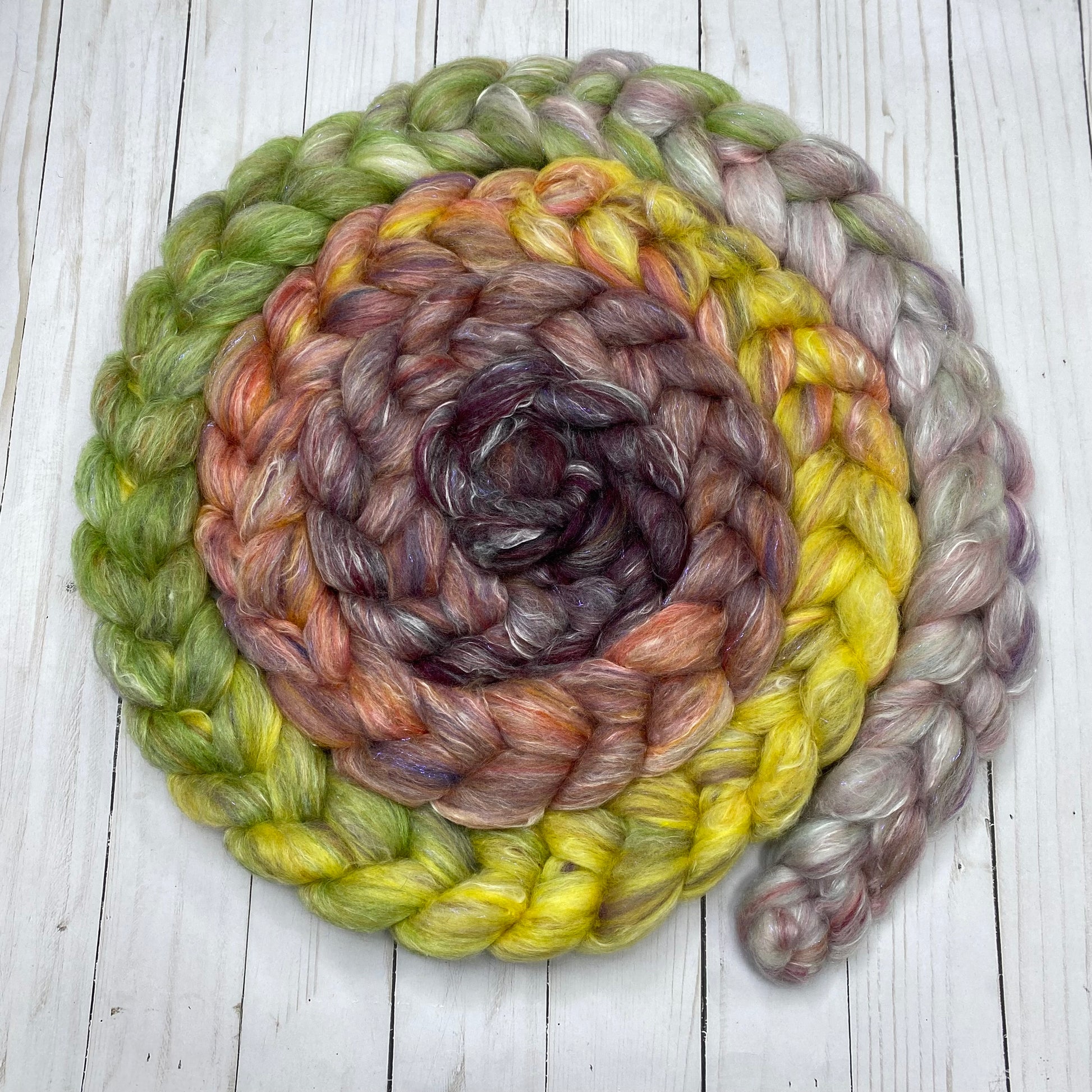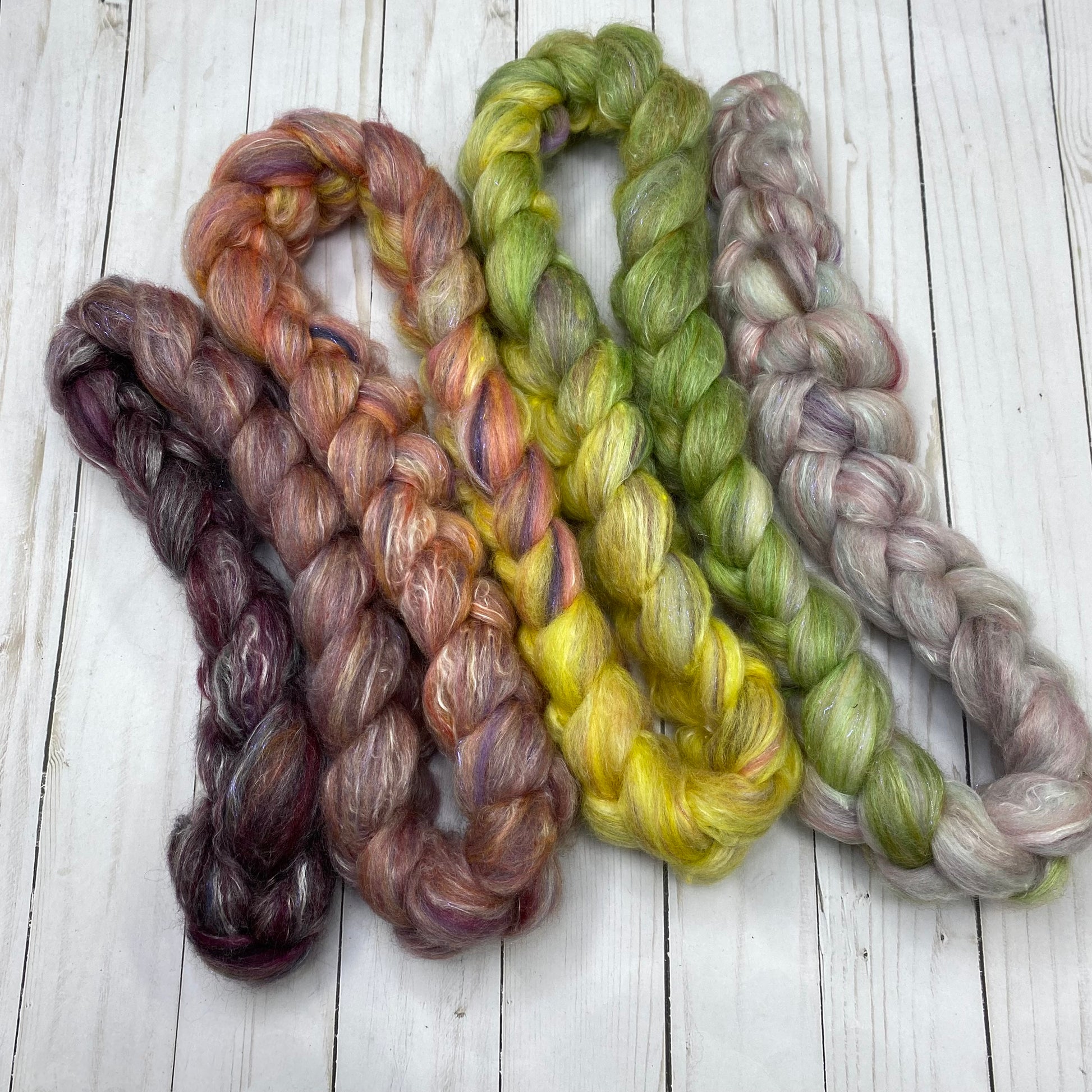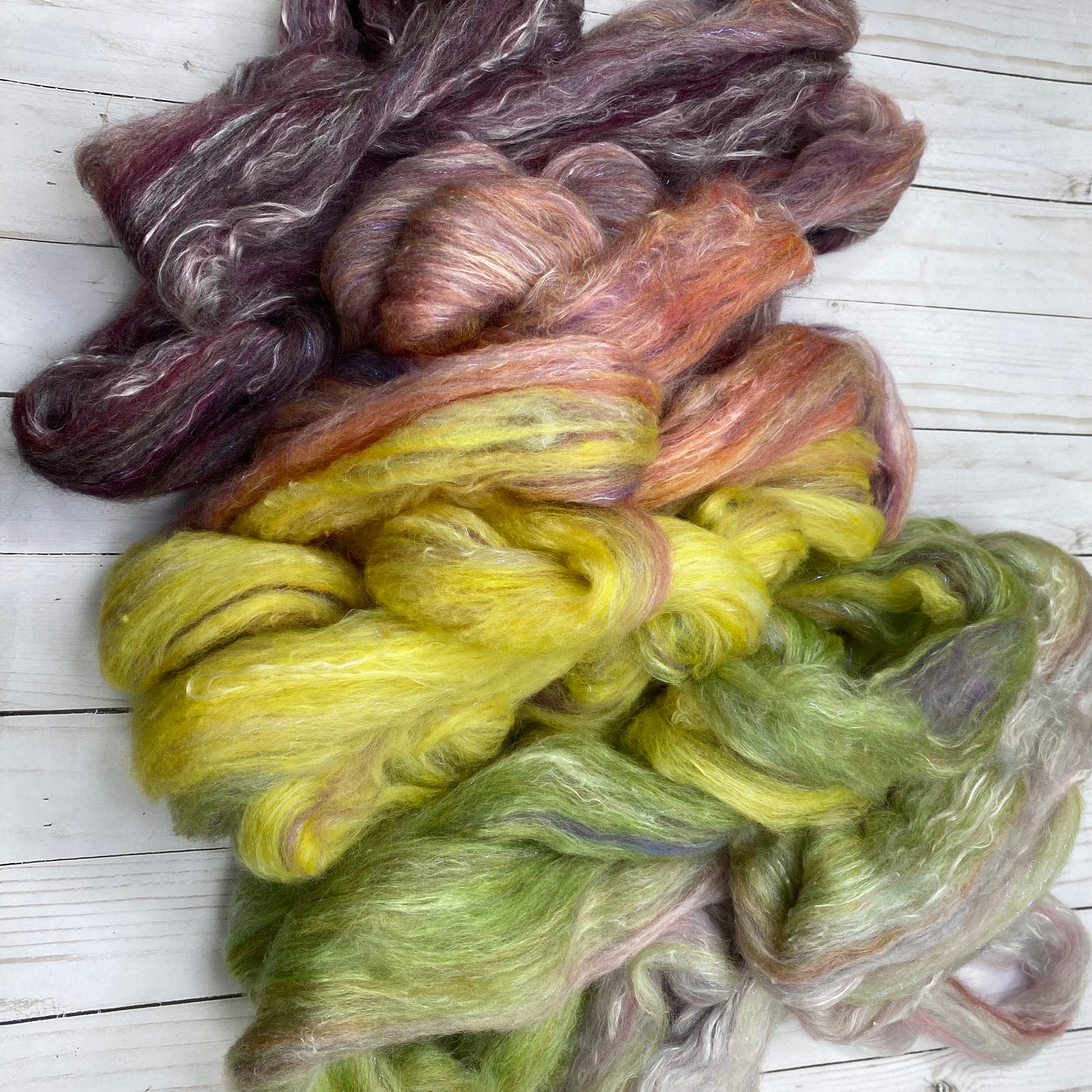 OOAK Blend of many many many ingredients, some dyed by me, some dyed by other artists, carded then pulled into this OOAK roving. 4.66oz/132g total. Ingredients include Merino, Mulberry Silk, Stellina, Shaniko